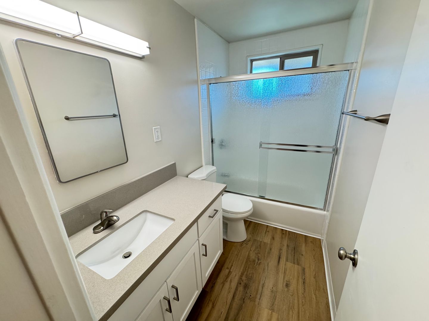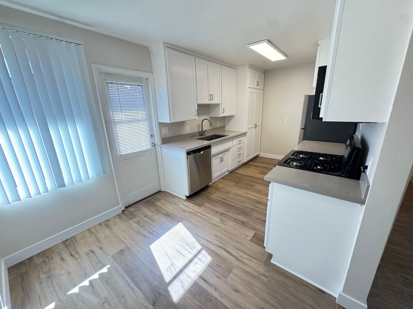Remodeled Single-story One bedroom, One bath apartment on a quiet street. Kitchen includes all appliances: Washer & Dryer, Dishwasher, Fridge & Microwave. Finishes include Quartz/Granite countertops, Plank & Tile flooring throughout. Parking accommodates Two vehicles: A single covered carport plus one additional tandem parking space. Rear outdoor area is included.
